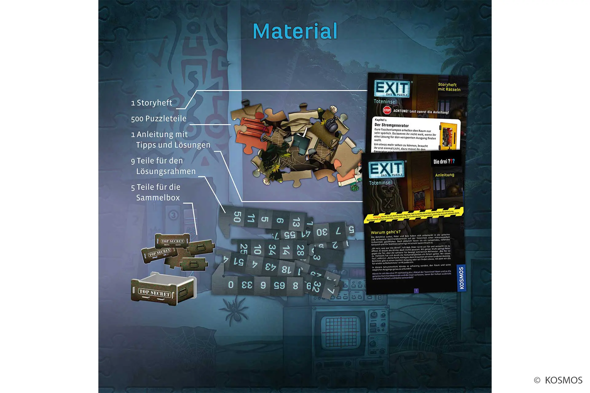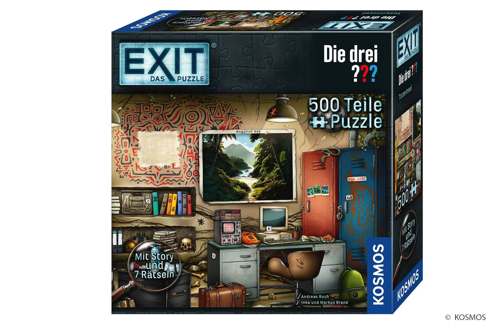 Das Drei ??? Toteninsel Puzzle Test führt ab 10 Jahren auf eine Vulkaninsel im Pazifik, wo Justus, Peter und Bob in einer Kommandozentrale eingesperrt sind. Während das 500-Teile-Motiv entsteht, entdecken Puzzler 7 versteckte Rätsel im Storyheft, die den Ausweg zeigen. Spezielle Puzzle-Stanze sorgt für einzigartige Teileform.