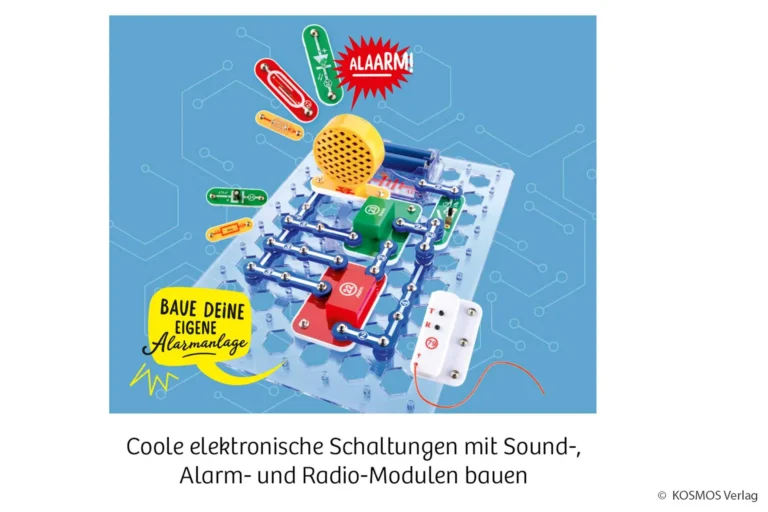 Besonders faszinierend war das FM-Radio-Modul: Nach dem Zusammenbau mit Antenne und Lautsprecher empfing unser 10-Jähriger tatsächlich lokale Sender – ein echter Wow-Moment. Die Alarmanlage mit Magnet- und Lichtsensor hat als „Einbrecher-Alarm” für das Kinderzimmer funktioniert. Auch der Elektromotor mit Schalter und das Sound-Modul mit Mikrofon sorgten für Experimentierfreude. Die Anleitung mit alltäglichen Beispielen („So funktioniert dein Wecker”) hat alles verständlich gemacht.
