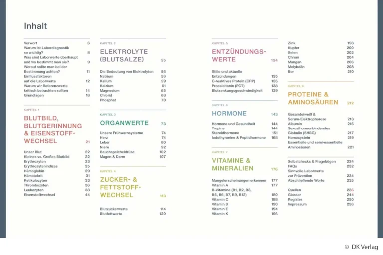 Die Struktur mit Tabellen, FAQs und Selbsttests macht das Nachschlagen einfach. Für jeden Wert werden mögliche Probleme (z.B. Eisenmangel, Leberwerte) und präventive Maßnahmen wie Ernährung oder Lebensstiländerungen beschrieben. Besonders hilfreich für Familien: Abschnitte zu Kinderwerten und altersbedingten Veränderungen.