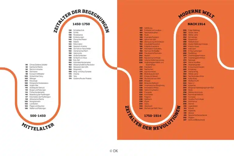 „Reise durch die Geschichte” ist ein beeindruckendes Sachbuch, das Kinder ab 10 Jahren auf eine visuelle Reise durch 13 Milliarden Jahre Weltgeschichte mitnimmt. Über 130 thematische Zeitleisten vermitteln auf Doppelseiten wichtige Epochen – vom Urknall über Dinosaurier bis zur modernen Energiewende.