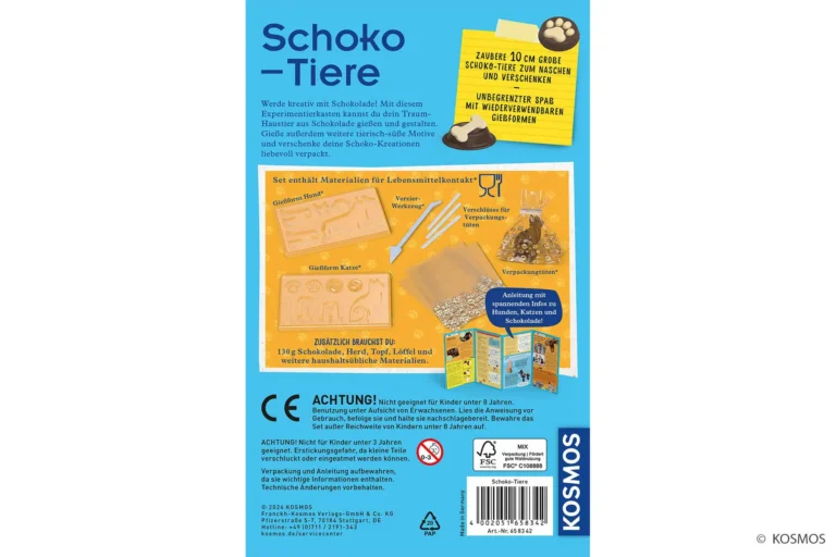 Das KOSMOS Experimentierset Schoko-Tiere macht Kinder ab 8 Jahren zu kleinen Schokoladenkünstlern. Mit Gießformen für Hunde, Katzen und Extras wie Pfötchen schmelzen sie Lieblingsschokolade und gestalten nach Herzenslust – einfarbig, gefleckt oder bunt. Die Anleitung führt kinderleicht durch jeden Schritt, sodass auch Familien ohne Vorerfahrung schnell loslegen können. Perfekt für regnerische Nachmittage oder als gemeinsames Wochenendprojekt.