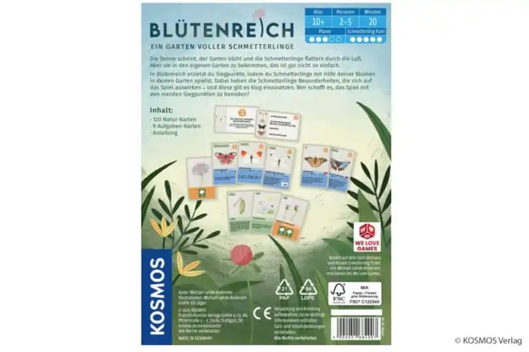 Die Gestaltung des Spiels, die lebendigen Farben und die liebevoll illustrierten Schmetterlinge und Blumen machen jede Partie zu einem visuellen Vergnügen. “Blütenreich” eignet sich hervorragend als Einstieg in die Welt der Familienspiele, fördert die Planungsfähigkeiten und die Vorstellungskraft und bietet dabei spannende Unterhaltung für alle Altersklassen.