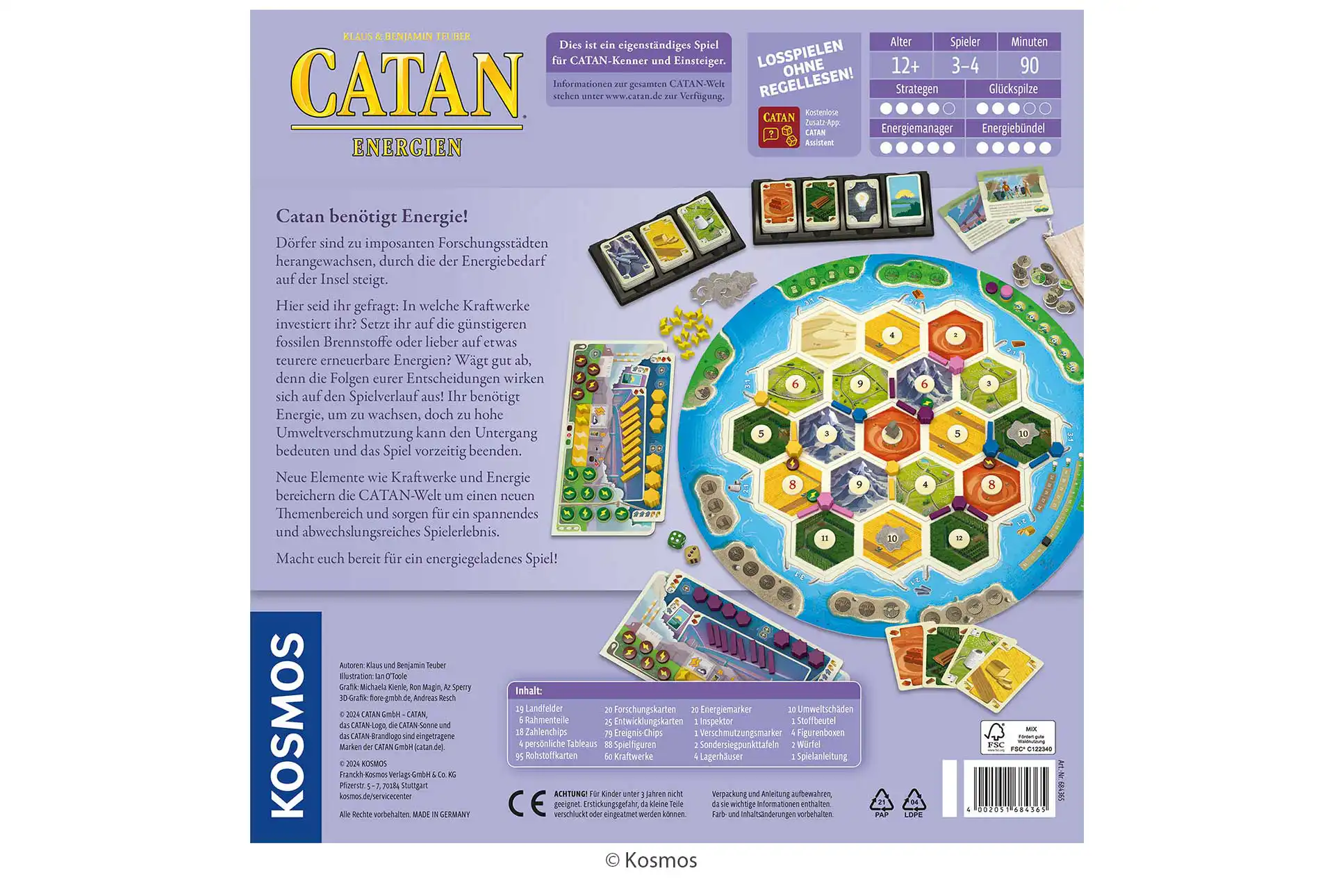 In “Catan – Energien” übernimmst du die Verantwortung für die Zukunft der beliebten Siedler-Insel. Deine Aufgabe: Errichte Kraftwerke, um den steigenden Energiebedarf einer modernen Gesellschaft zu decken. Doch jede Entscheidung hat Konsequenzen. Setzt du auf fossile Brennstoffe, steigt die Umweltverschmutzung. Auch der Bau von Dörfern und Forschungsstädten belastet die Natur. Erneuerbare Energien hingegen können die Verunreinigungen neutralisieren. Finde die Balance zwischen Fortschritt und Nachhaltigkeit in diesem anspruchsvollen Strategiespiel. Triff kluge Entscheidungen, denn die Zukunft Catans liegt in deiner Hand. Ein spannendes eigenständiges Spiel, das zum Nachdenken anregt und die ganze Familie begeistert.
