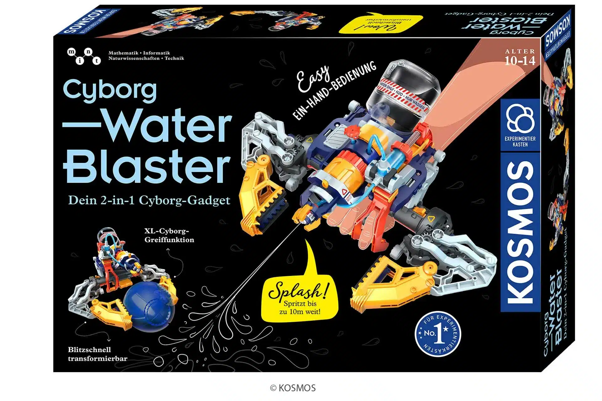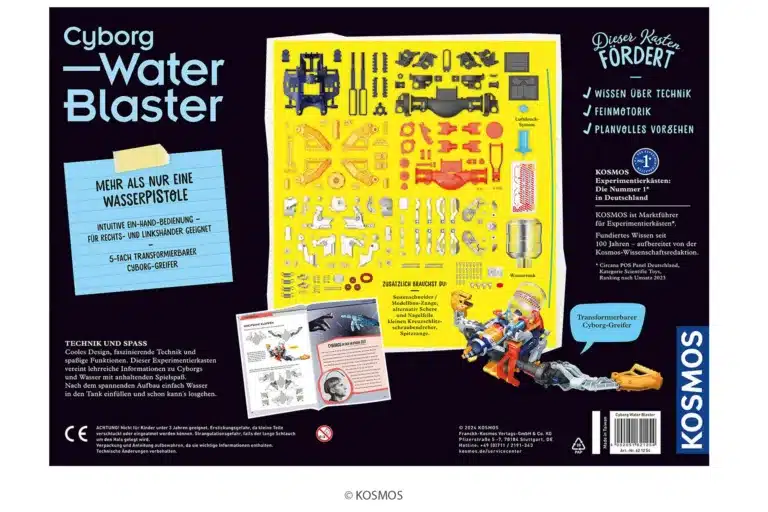 Der Cyborg Water-Blaster von KOSMOS ist ein Experimentierkasten, der Technikbegeisterung mit actionreichem Wasserspaß verbindet. Kinder von 8 bis 14 Jahren bauen aus zahlreichen Bauteilen ihr eigenes 2-in-1-Gadget: einen Wasserblaster, der bis zu 10 Meter weit spritzen kann, kombiniert mit futuristischen Cyborg-Greifarmen.