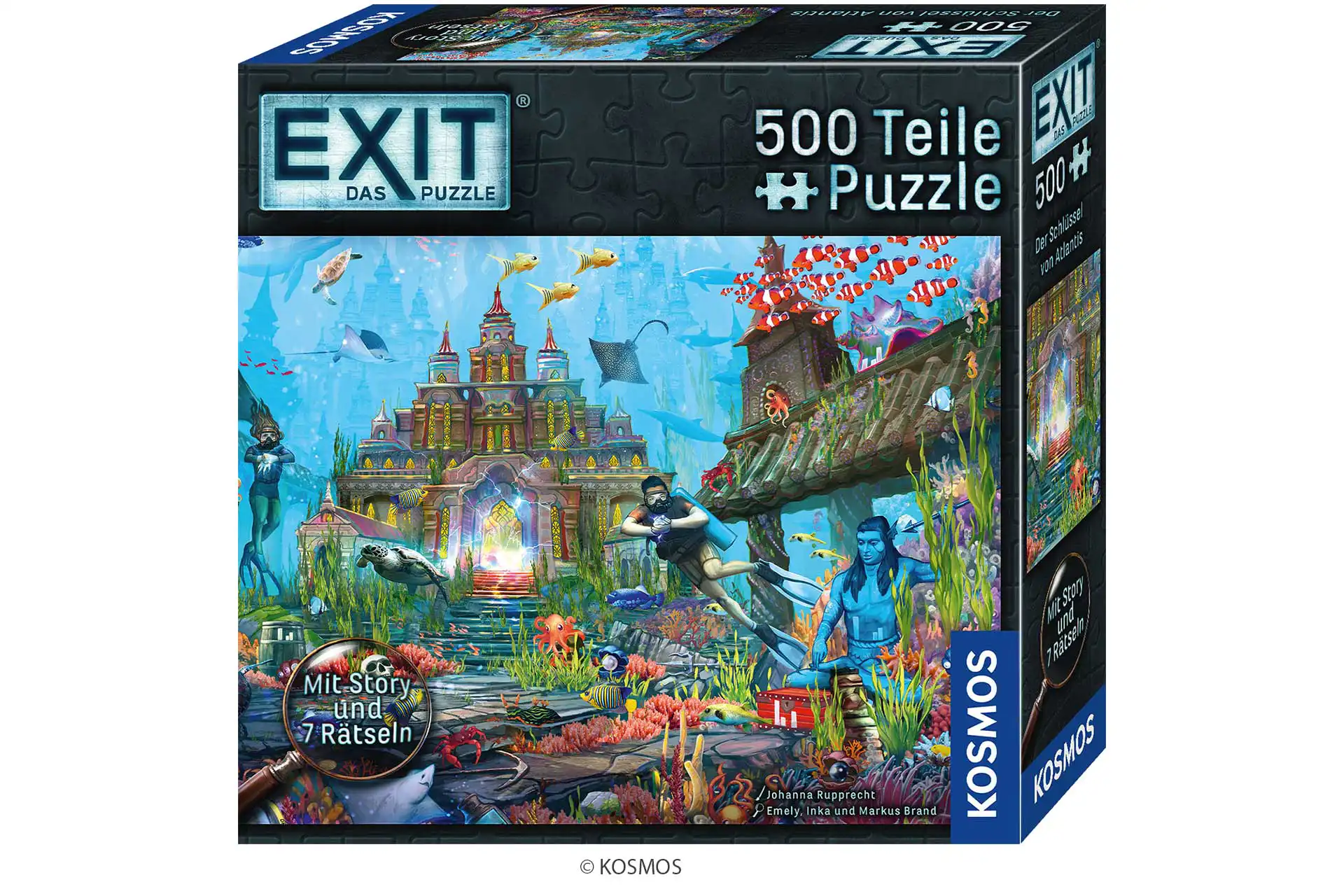 Taucht ab in die Tiefen des Ozeans und entdeckt das sagenumwobene Atlantis! Die 500 Teile des hochwertigen Puzzles eröffnen eine magische Unterwasserwelt mit bunten Meerestieren und versunkenen Schätzen. Eine Escape- Geschichte führt Puzzlerinnen und Puzzler ab 10 Jahren durch sieben abwechslungsreiche Rätsel. Gelingt es, im finalen Rätsel das große Geheimnis zu lüften und den Schlüssel zum Palast von Atlantis zu finden?