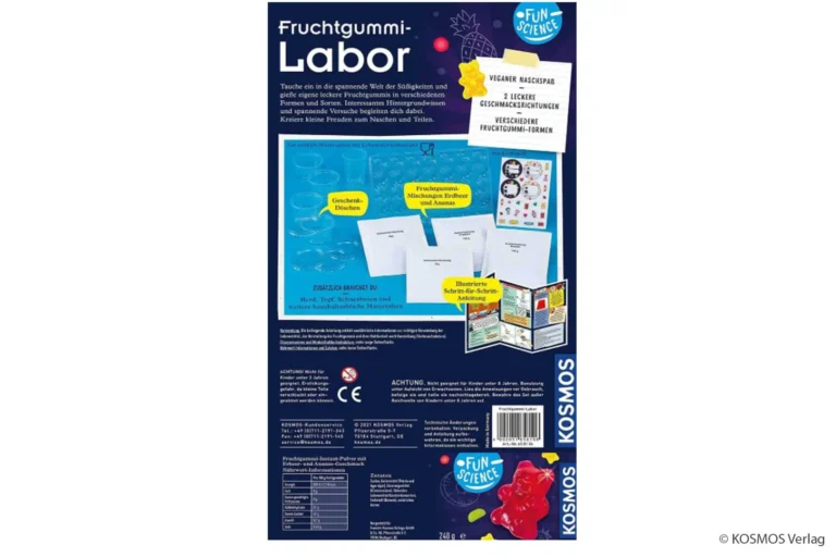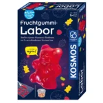 Das Fun Science Fruchtgummi-Labor von KOSMOS verwandelt Kinder ab 8 Jahren in kleine Lebensmittelchemiker: Sie stellen ihre eigenen veganen Gummibärchen in Erdbeere- und Ananas-Geschmack her. Einfach Zuckermischung und Geliermittel (Pektin, Agar-Agar) aufkochen, in Formen gießen – fertig sind die selbstgemachten Süßigkeiten.